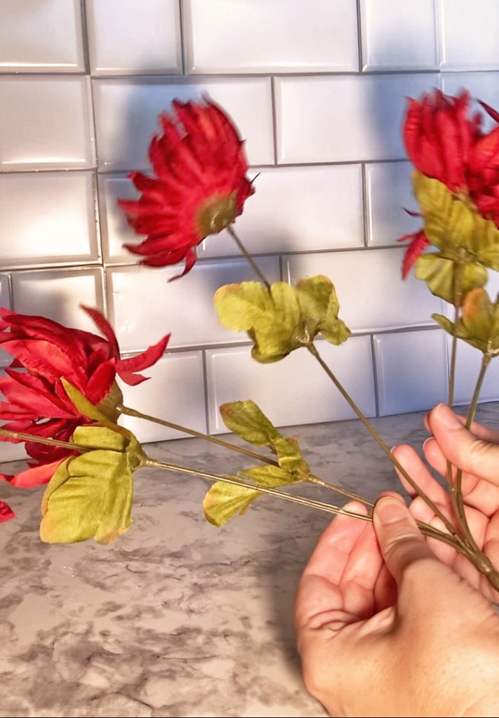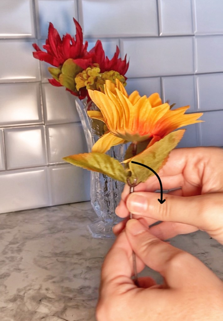 Bend one of those stems back and give it a snip. Wire cutters are the best tool for this, but you can also use craft scissors: you may just have to bend the wire back and forth a few times to get it to snap. Now, this will make your stems shorter than what you may find for a higher price at a craft store. But this is the trade-off for using DT flowers. Plus, if you put a piece of floral foam toward the top inside of an opaque container (like a galvanized bucket) and push your stems in there, you can still give the illusion that you have long beautiful stems without having to break the bank on the flowers!