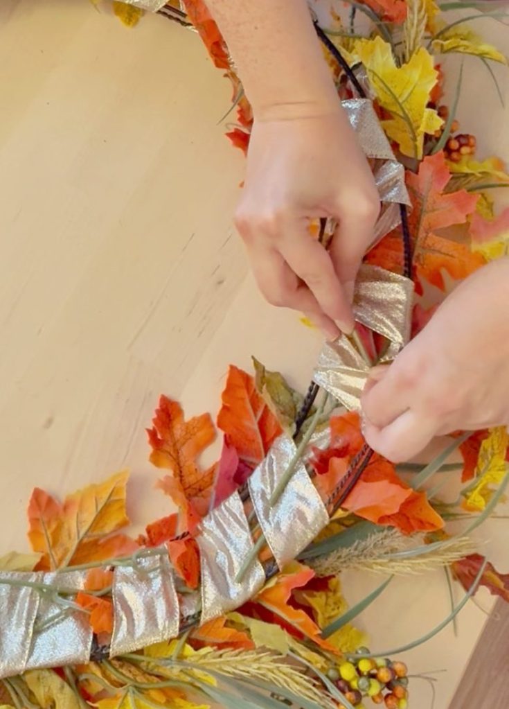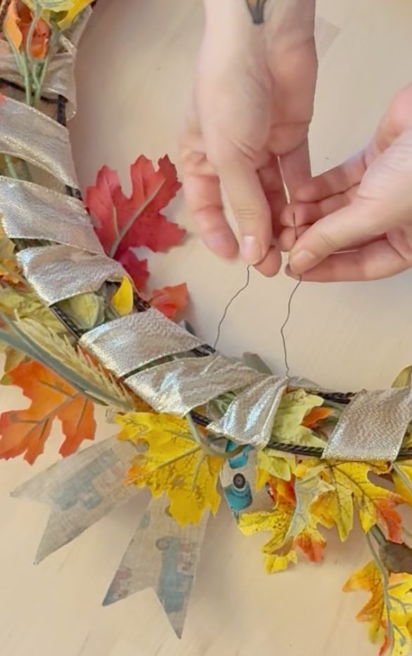 So at this point, all of your leaves should be tucked into the ribbon. And it’s possible you have some pesky stems poking out of the back of the wreath.