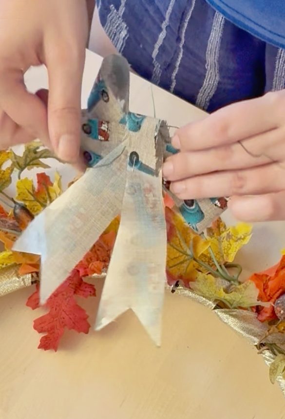 I added this little pre-made bow to the bottom of the wreath. Slide a piece of floral wire into the loop of the bow and set it in place. You’ll slide those ends of the floral wire through the wreath form and to the back. Then flip the wreath over, pull the floral wire tight, and twist it to secure. You can hide the ends of the wire under one of the ribbon loops.