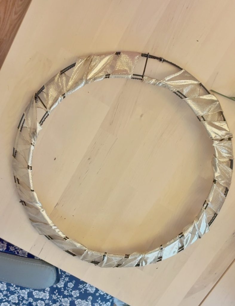 Next, I needed to cover the wreath form with my wired ribbon. I like to leave a space open at the top so that the wreath hook has a space to fit in.