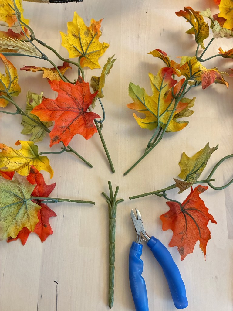 • Faux fall leaf branches. You can find these as single stems (like this) or as bushes (like this) which you’ll cut down into individual stems. I got mine at Michael’s, but dollar stores are also a good place to look for these.